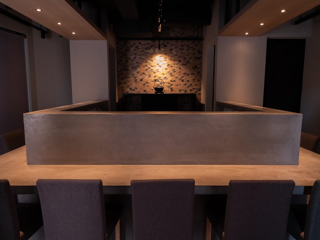 洗練された和モダンの内外装と、ライブキッチン形式のコの字カウンター。