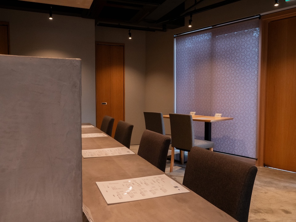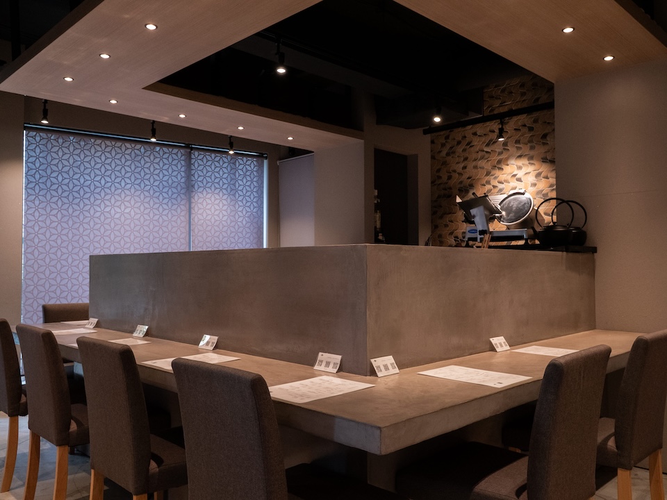 洗練された和モダンの内外装と、ライブキッチン形式のコの字カウンター。